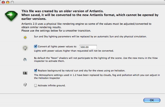 Artlantis files saved in a version earlier than 2.0 must be converted when they are opened. When this occurs, Artlantis displays a data conversion dialog: