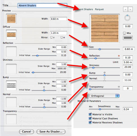 Its size in pixels must be the same as the diffuse image. Otherwise, Artlantis will stretch it depending on the size of the diffuse image. The Shininess image is used to modify the cursor value: Same as Reflection.