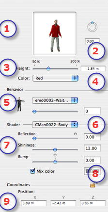 - Behavior:Use the menu to choose the character's attitude: standing, sitting, running, etc.